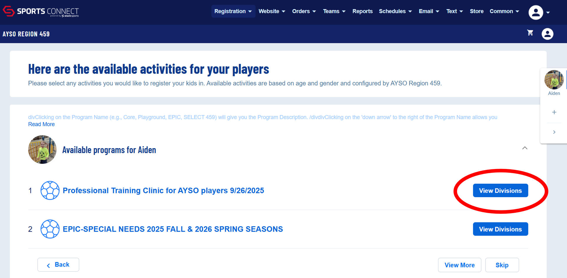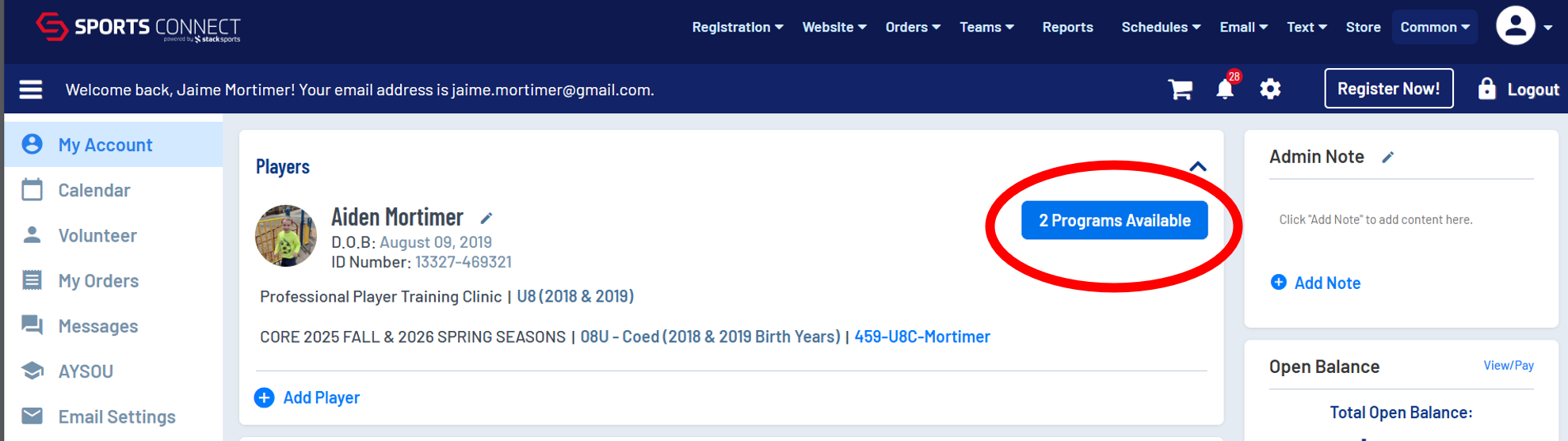 2. Look at your main page and you will see your players listed at the top of the page. To the right of each player's name, there is a clickable button that tells you how many programs are available to register into. Each player likely has a button that says "2 programs available."